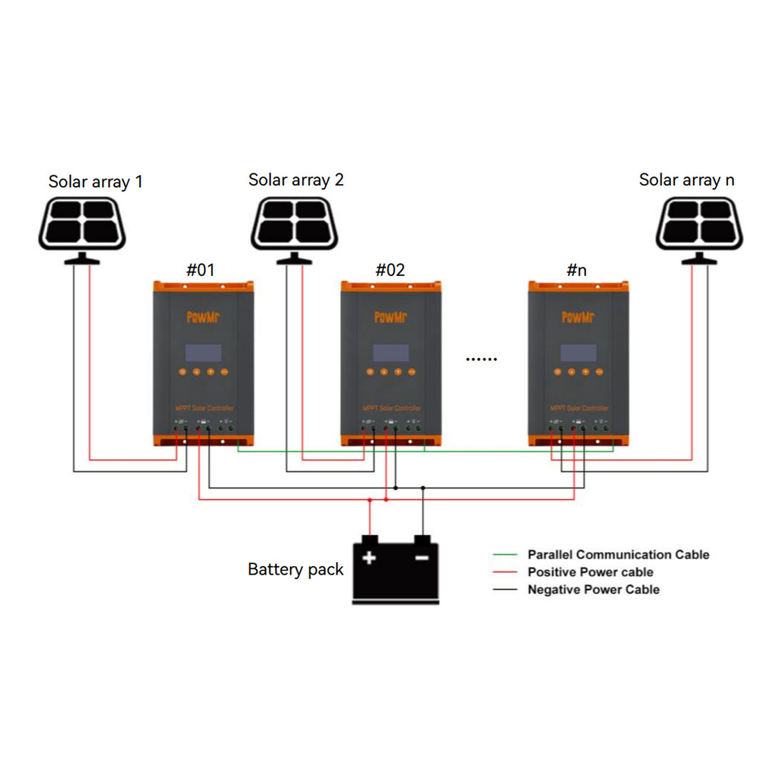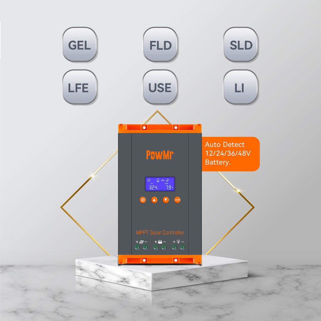 The built-in DSP controller, coupled with high-performance capabilities, automatically detects 12V, 24V, 36V, and 48V solar battery voltages. It offers compatibility with a wide range of Deep Cycle battery options, including Lithium, LiFePO4, Li(NiCoMn)O2, Flooded, Sealed, Gel, and User-Defined batteries.