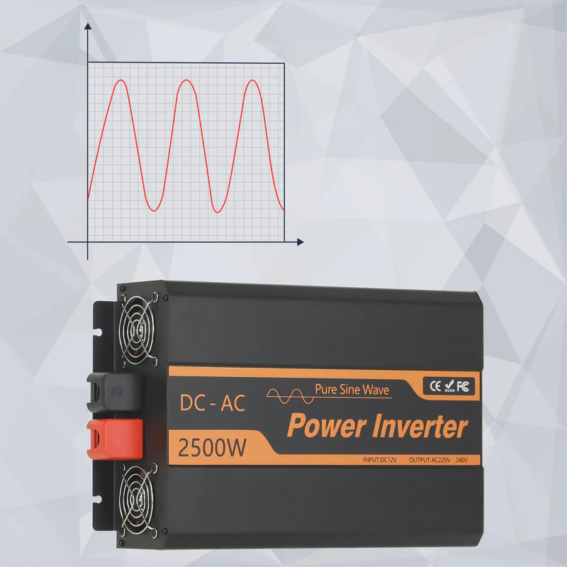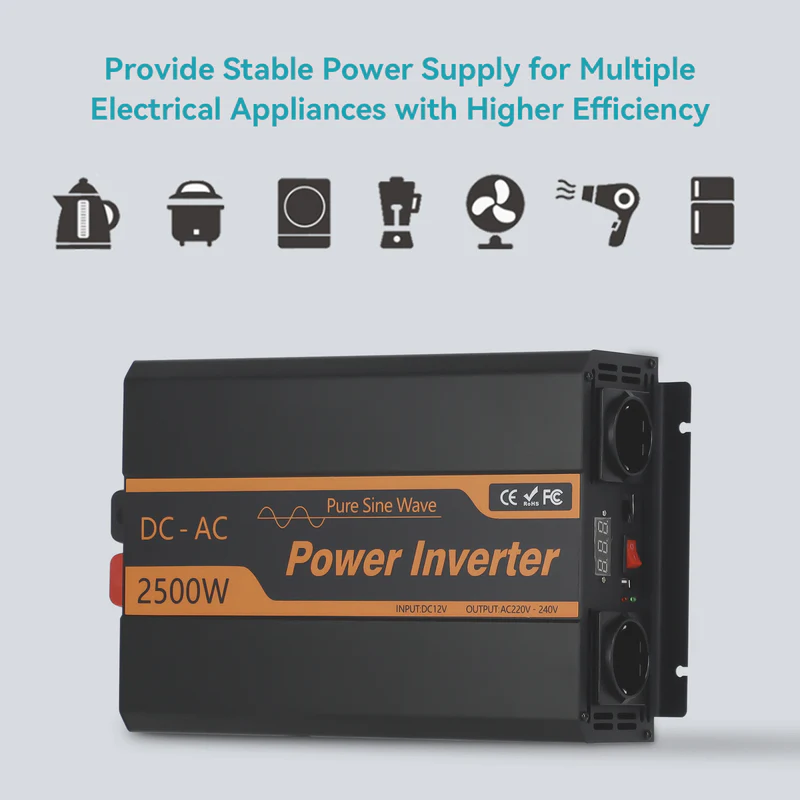 Provides true rate pure sine 2500w continuous power, converts 12V dc battery power to standard 220V ac, high conversion efficiency (>90%), ,advanced pure sine wave technology provides quality AC equivalent to grid power, chip controls the output and keeps constant, ensure that the inverter outputs stably without damaging the load.