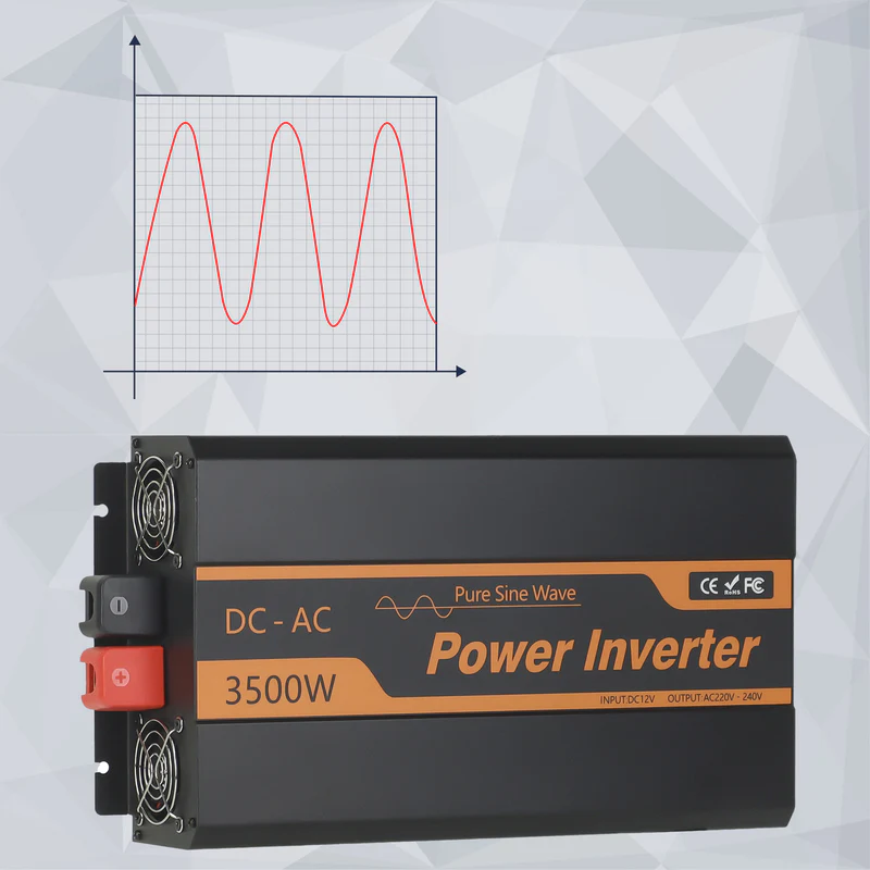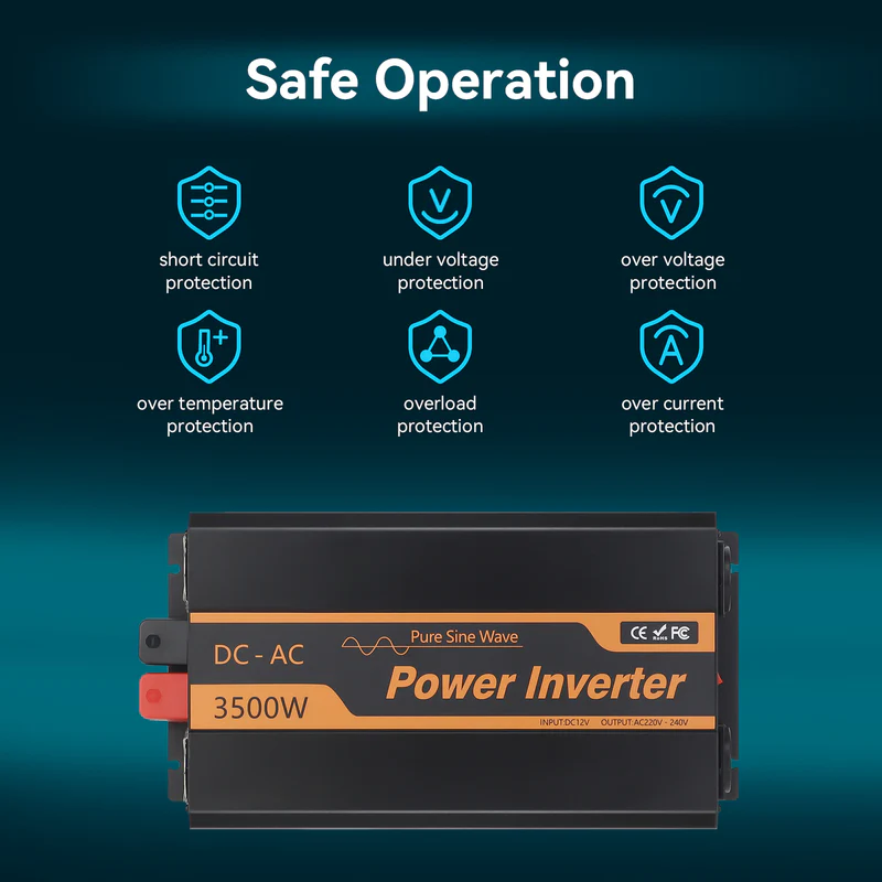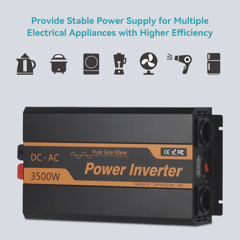 Provides true rate pure sine 3500w continuous power, converts 12V dc battery power to standard 220V ac, high conversion efficiency (>90%), ,advanced pure sine wave technology provides quality AC equivalent to grid power, chip controls the output and keeps constant, ensure that the inverter outputs stably without damaging the load.